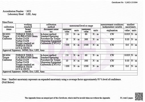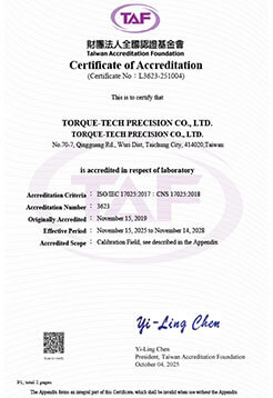 An in-house laboratory approved by the international accreditation foundation has been set up in year 2013 to calibrate the manual torque tools, mechanical test devices and torque transducers.